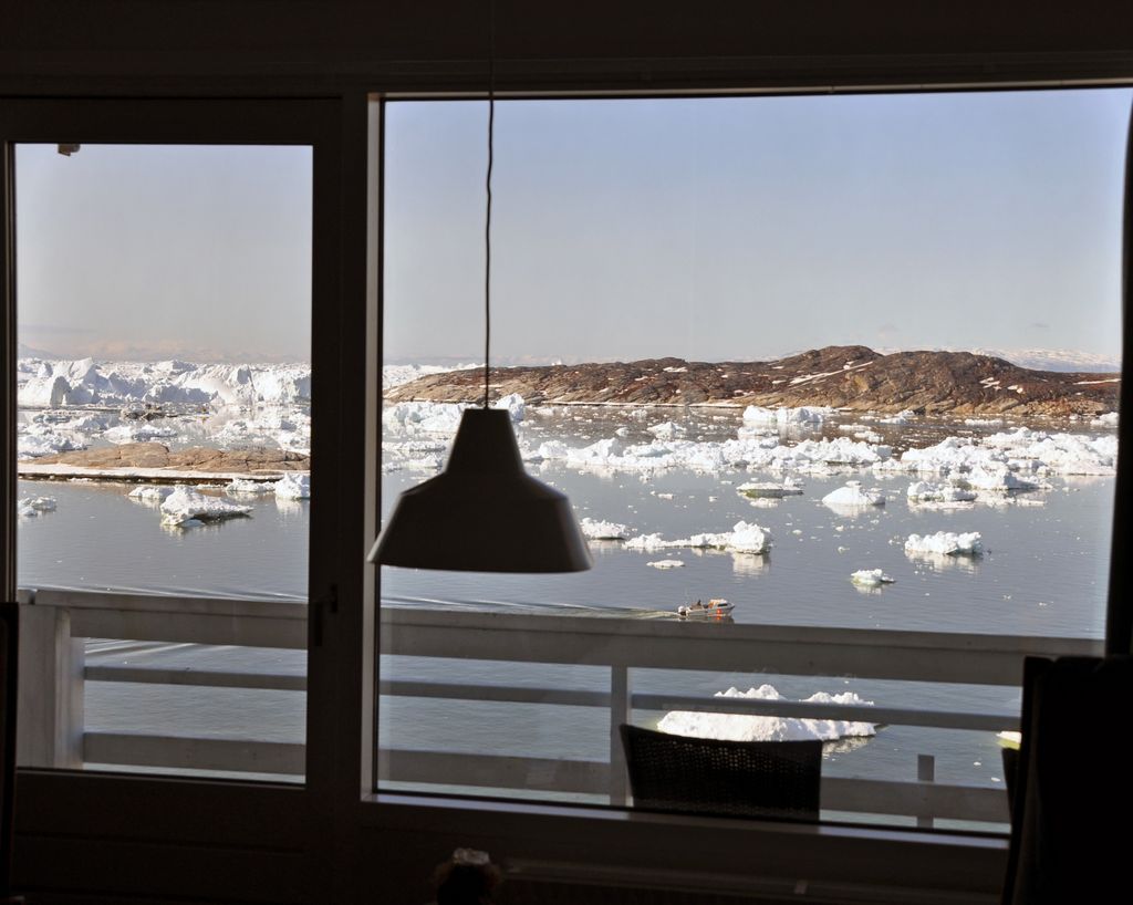 Ausblick auf die Eisberge von meinem Zimmer im Hotel Hvide Falk in Ilulissat
