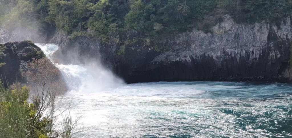 Die Weiterfahrt ging zu den „Saltos del Petrohue“. Beschrieben mit „Eine Ansammlung von Stromschnellen und Wasserfällen, die sich über Lavagestein der umliegenden Vulkane ergießen“. Hatte sich gut angelesen. War es auch, geschätzt die ersten fünf Minuten lang auf dem Fußweg zu den Fällen wegen meiner Vorfreude, die oft die Schönste ist. Wie auch hier, denn in der Realität angekommen, war der Blick darauf eher bescheiden: