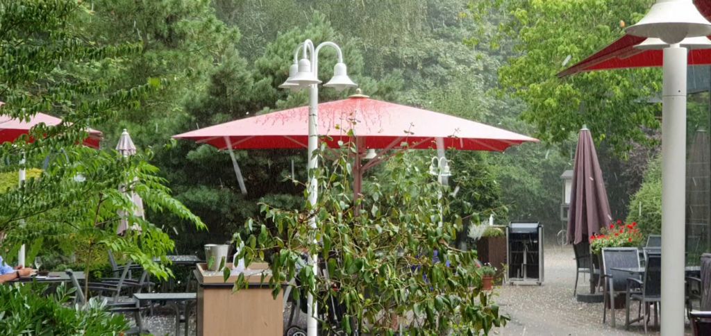 Ein Hagelschauer im Biergarten vom Hotel Mövenpick in Münster