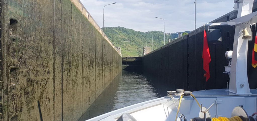 Auf dem Weg nach Zell hatte ich viel zu tun. Die Schiffdecks und die Weinlagen spiegelten sich herrlich in den Fenstern der „MS Elegant Lady“. Ich hatte viele Versuche, um schöne Bilder aufzunehmen, und konnte mich schwer entscheiden, was das Beste war. Hier eine Auswahl:
